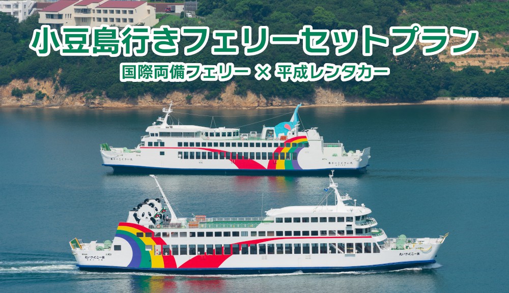 平成レンタカー高松空港店(087-879-7753)にお電話していただき、「小豆島行きフェリーセットプラン」とお伝えいただきます。乗船人数によって旅客運賃が変わりますので、同乗者の人数をご予約時にお知らせください。そのままご希望の日時のレンタカーをご予約下さい。(繁忙期等でご用意できない場合もございます) |
