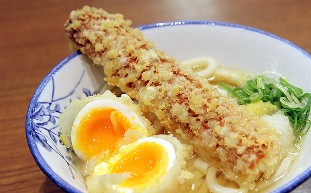 揚げたての天ぷらが人気で、半熟卵・ちくわ・げその3種類は、注文すると揚げたてサクサクで出てきます。もっちりした麺にすっきりおいしいダシをかけ、天ぷらをのせていただきましょう。