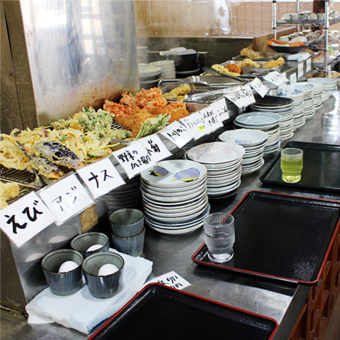 揚げたての天ぷらが人気で、半熟卵・ちくわ・げその3種類は、注文すると揚げたてサクサクで出てきます。もっちりした麺にすっきりおいしいダシをかけ、天ぷらをのせていただきましょう。